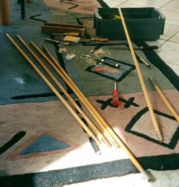 Erste Saisonvorbereitungen auf dem Küchenfussboden: Kimmstäbe aus dem Kanu-Programm werden auf Jollenlänge gekürzt. Ein paar angeknackste Stäbe müssen ersetzt werden.