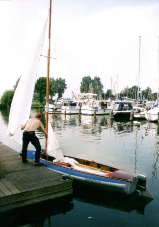 Am Steg werden die Segel angeschlagen, das Schwert in die Schwerttasche geschoben, das Ruder eingesteckt und die Pinne in das Ruder gesteckt. Wenn man den Verklicker vergessen hat fällt es meistens jetzt erst auf. Segeln wir ohne oder nehmen wir den Mast noch mal runter - das ist dann immer die Frage. Wegen einiger Reihen hoher Bäume am Ufer ändern sich Windrichtung und -Stärke an verschiedenen Stellen auf dem Zuidplas. Es empfiehlt es sich darum, mit Verklicker zu segeln. Andererseits sind an schönen Wochenenden so viele andere Segler unterwegs, das es schon ein wenig eng werden kann. Aber dann ist auch immer ein anderer Verklicker in Sicht.