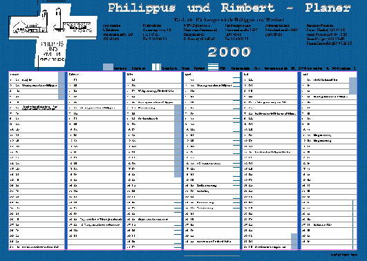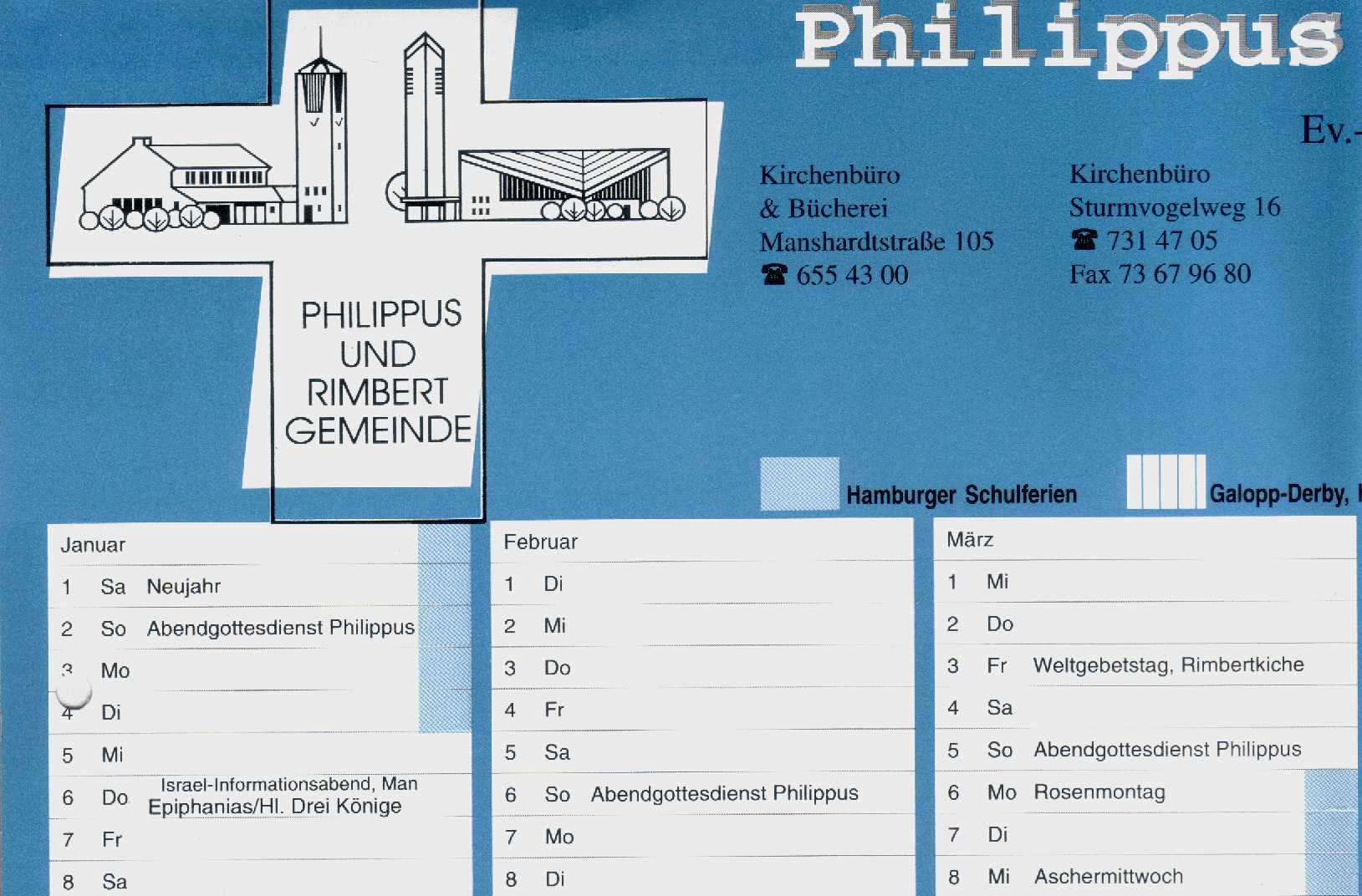 Bevor sich im Jahre 2000 die Philippus- und die Rimbergemeinde zusammschlossen, gab es Ende 1999 eine gemeinsame Jahresplanung. Schnell füllten sich die Übersichtsseiten im Kalender und die Idee, einen Jahresplaner zu erstellen, wie ihn Firmen als Werbegeschenke verteilen, wurde geboren.